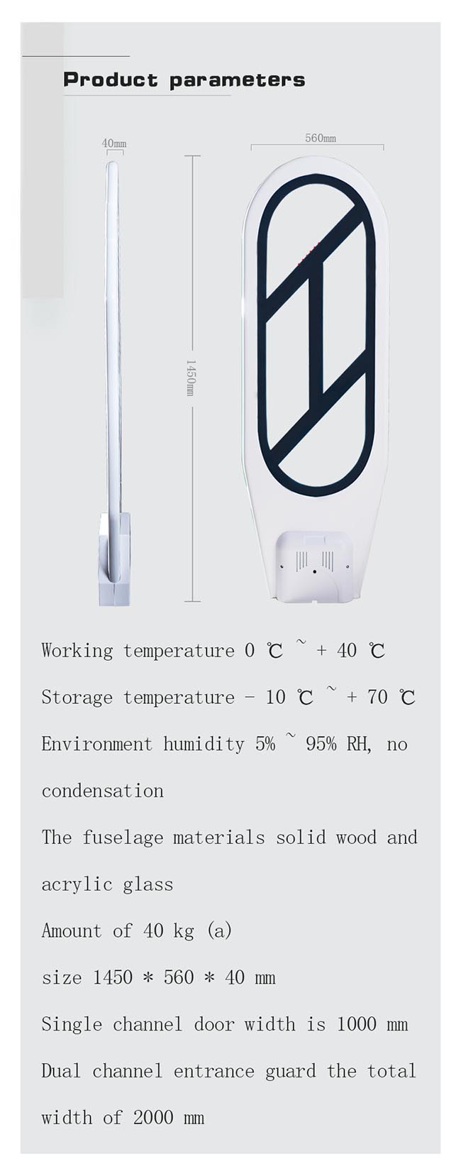 Characteristic description; Microcomputer chip control; microcomputer control technology, can prevent the strong magnet to enter the store, so as to effectively eliminate the magnetic degaussing and cannot be detected by the phenomenon, to minimize the loss. Adopting the microcomputer chip control technology, according to the environmental setting sensitivity, convenient and flexible operation. With the automatic monitoring of environmental function, through a reduction, enables the device to operate in the optimum state With the number and frequency of alarm function of statistics, and the data can be saved, even if the power is not lost The design of human nature: anti-theft door appearance, elegant generous, full of modern flavor; strong abrasion resistance, no deformation; flame retardant engineering materials Synthetic sensitivity: using electromagnetic anti-theft technology, small blind area, comprehensive sensitivity in 98% above Green environmental protection; product output power is only 6W, with ultra low frequency electromagnetic wave detection technology,, no radiation on the human body, no pollution to the environment, more than 10 years of service life. Quality assurance; in line with national standards, for six consecutive years by ISO; 9001 international quality certification. Additional optional functions; The set RS485 communication technology, the log can be input into the computer management, and the interface and functionality in accordance with customer requirements can be set Technical parameters: Adapt to: