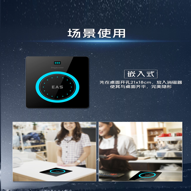 安裝方式:(嵌入式)先在桌面開孔21×18cm,放入消磁器使其與桌面齊平,達(dá)到隱形